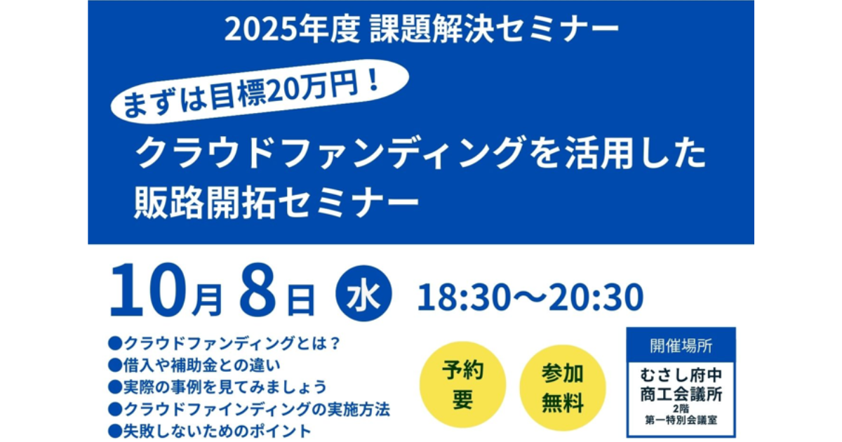 東京都府中市 課題解決セミナー「まずは目標20万円!クラウドファンディングを活用した販路開拓セミナー」